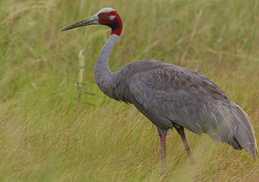 (Grus antigone) A large non-migratory crane found in parts of the Indian Sub-continent SE Asia and Australia. The tallest of the flying birds, standing at a height of up to 1.8 m. Often mistaken for Brolgas in Australia, they may be distinguished by the greater amount of red colouration to the head and neck.