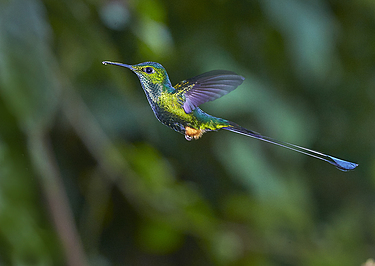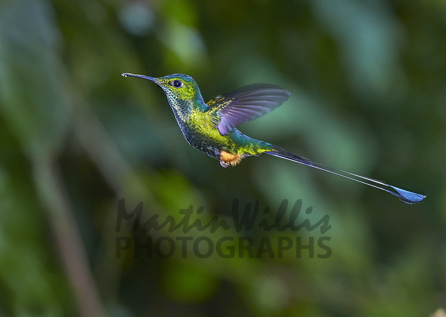 Rufous-booted Racket-tail -flight